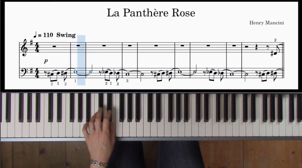 Classique jazzy réduit pour pianistes débutants, ce fameux thème de « La Panthère Rose » permet d’aborder ce qu’on appelle le rythme Swing : quand deux croches se succèdent, on les joue comme s’il était écrit une noire et une croche en triolet. Et ça swing ! 😉