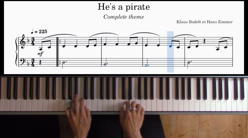 Petit challenge demandé par mes jeunes élèves, voici donc le thème complet « He’s a pirate », et joué au tempo original, s’il vous plaît ! Donc accrochez-vous les doigts, ça carbure ! Rien de bien compliqué dans la partition, c’était le but de simplifier. Mais le tempo change toute la donne……
